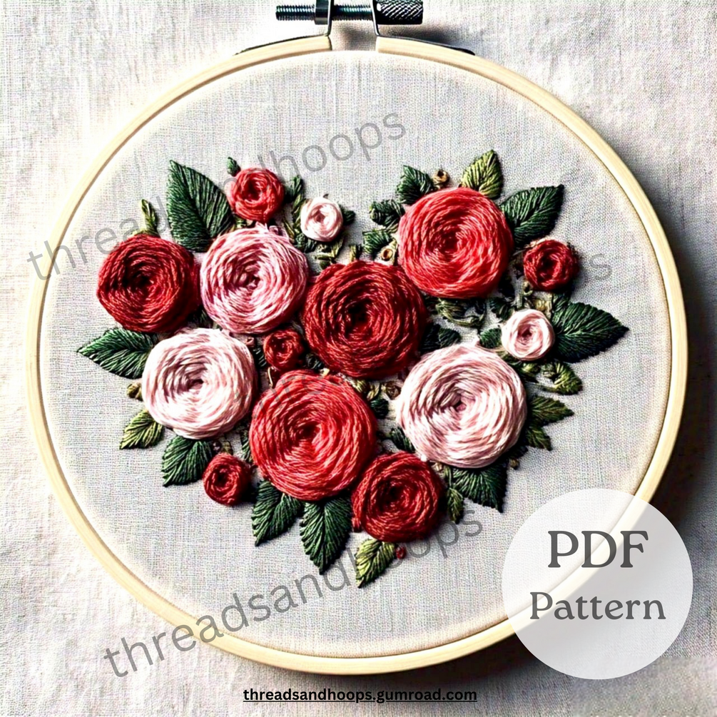 Rose Heart Embroidery Pattern, Heart-Shaped Roses & Leaves Embroidery Design, Romantic Rose Heart Wreath Embroidery, Hand Embroidery Pattern, Crafts, DIY Embroidery, Beginners Embroidery Pattern, Digital Download