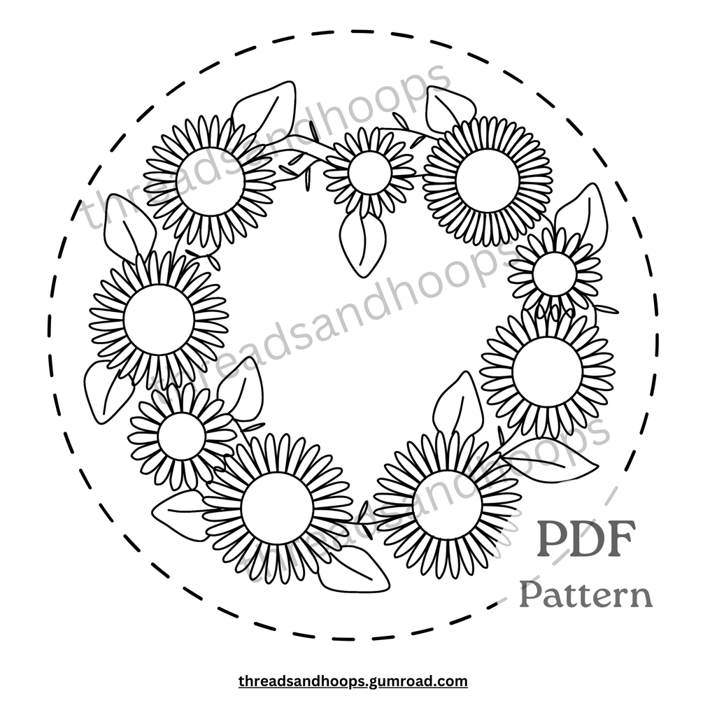 Brighten your embroidery collection with this stunning hand embroidery pattern featuring sunflowers arranged in the shape of a heart. The heart shape formed by the sunflowers and foliage radiates warmth and love, making it the perfect project for any occasion. This pattern is ideal for stitchers of all levels and includes DMC color suggestions to guide your stitching. Bring a burst of sunshine into your embroidery hoop with this joyful sunflower design, Happy Stitching!
