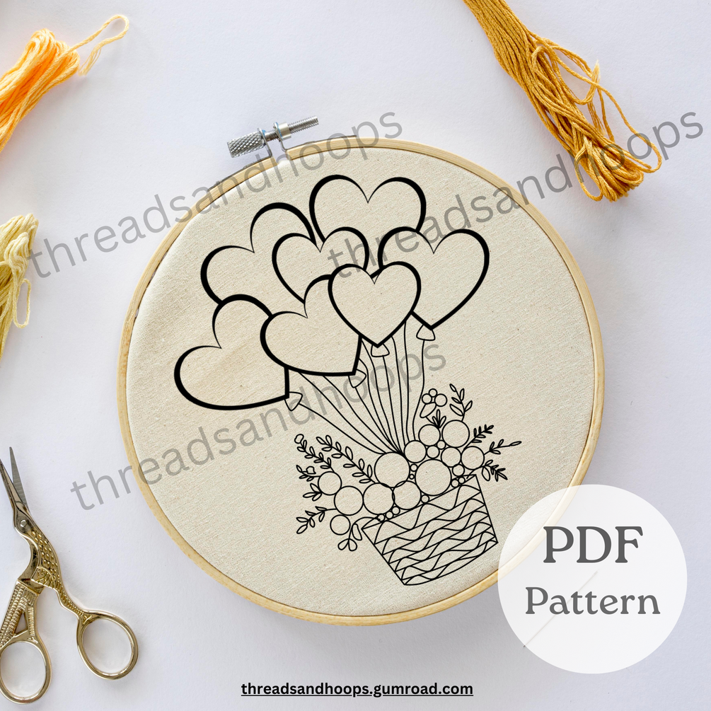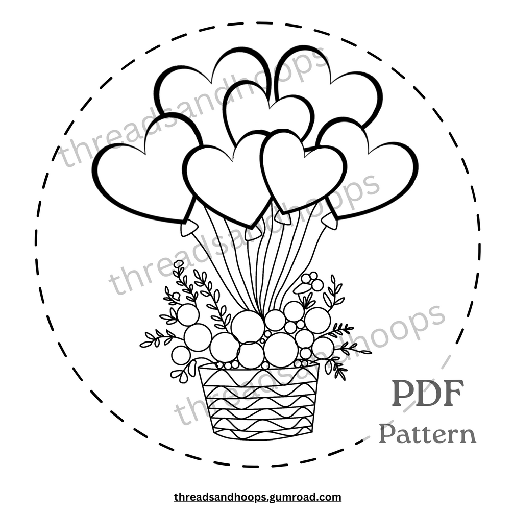 Heart-Shaped Balloons & Floral Basket Embroidery Pattern, Floral Basket with Heart Balloons Embroidery Design, Hand Embroidery Pattern, PDF Pattern, Crafts, DIY Embroidery Pattern